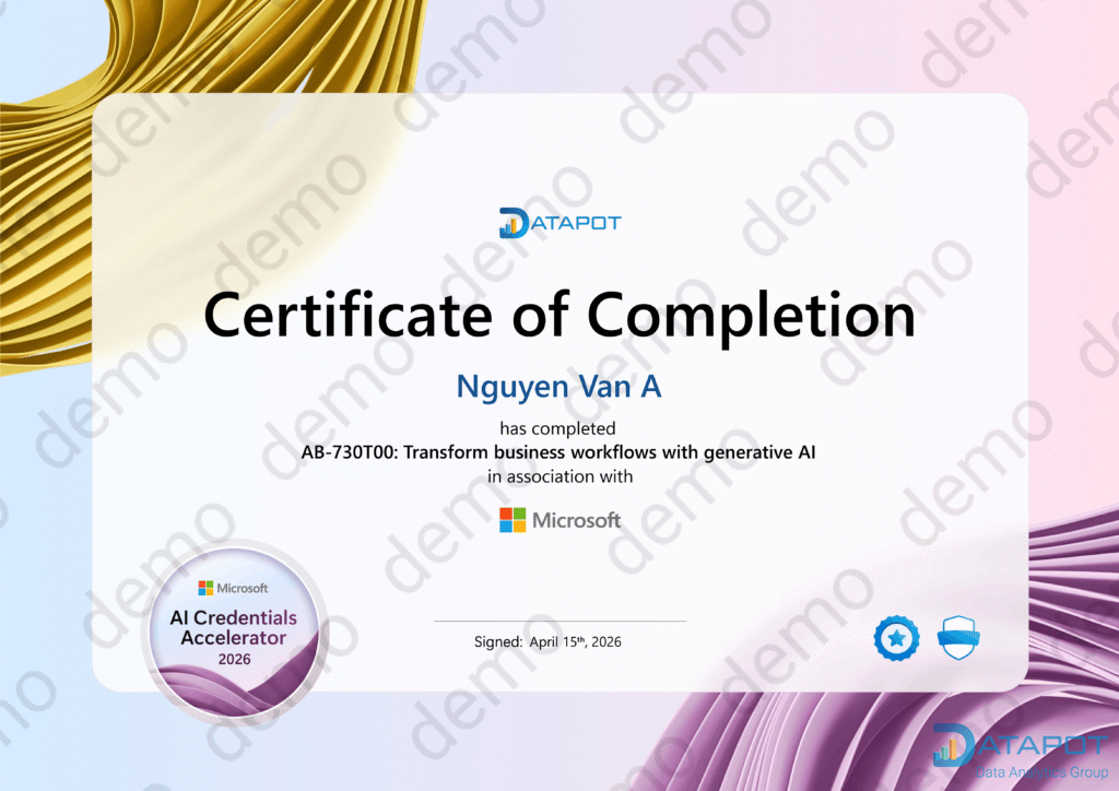 - Chủ đề: AB-730T00: Transform business workflows with generative AI – Chuyển đổi quy trình làm việc với AI tổng quát